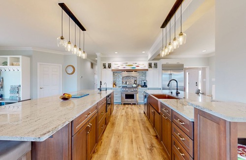 Inside your waterfront escape, discover a gourmet kitchen with ample gleaming countertops, high-end appliances, and a copper farmhouse sink. Your family will adore relaxing and unwinding in the adjacent living room with ample seating along with a large screen TV. Also on this main level, you will find a designated office space, the first of the main bedrooms, along with another bedroom and full bathroom.