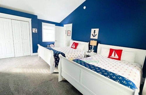 5 Bedrooms, 2 full and 2 half bathrooms. Off the living room is a bedroom with a queen bed and a full bathroom. The upper level has two bedrooms, one with a queen plus full bath and a second bedroom with two queen beds. On the lower level, there are two bedrooms, one with a queen bed and the other with twin-over-full bunk beds.