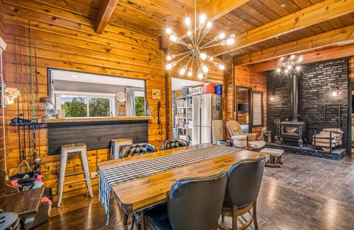 Inside, you'll find an eclectic blend of rustic and modern, creating a real sense of solitude for you and your guests. With the well-equipped, full kitchen and gas grill on the deck, you can prepare that fresh rainbow trout you caught off the private floating dock and then dine together indoors or out. Stoke up the fire in the woodstove in the cozy living area or head outside to gather at the firepit and roast s'mores as the stars emerge. Additional amenities include a private washer/dryer, paddleboat, two kayaks, and a classic clawfoot tub in the bathroom.
