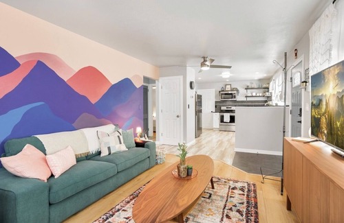 Indulge in the chic, boho style of the Lil' Love Shack. From the custom mountain mural to the cozy fireplace, this fully furnished space exudes warmth. The spacious kitchen features granite countertops, fresh paint, and new flooring. Everything is brand new, including hotel-standard linens, furniture, and furnishings. You'll have the entire home to yourself, with two inviting bedrooms, a large bathroom, and a vast yard with two charming patios.