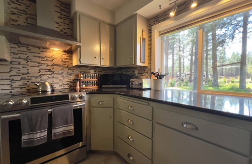 Inside, you’ll find a home that is cared for with love and attention to detail. The décor balances rustic touches with modern amenities, offering warmth, comfort, and functionality. From a fully equipped kitchen to inviting, open-concept living spaces, you’ll have everything you need to feel at home. Large windows allow natural light to pour in, highlighting the peaceful forest views just beyond the backyard. The large windows looking out from the kitchen to the backyard provide the perfect view of your kids or pets enjoying the spacious room to roam and views of the stunning Deschutes National Forest.
