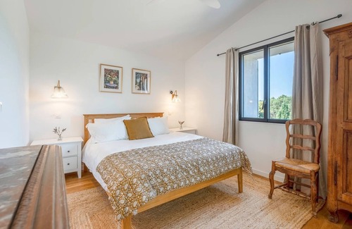 Bedroom 5 - Located in independent gite a few steps from the main house, with bedroom (180cm bed), sitting area, kitchen, bathroom (walk-in shower) and separate terrace overlooking Gordes. Air conditioning.