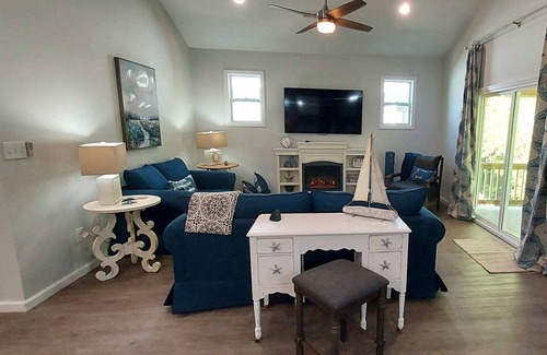 Experience coastal living in our 3BR/2.5BA home on pilings in downtown Jacksonville, NC, just minutes from the river, parks, and public dock. Perfect for military families, it's 10 min from Lejeune and New River MCAS Main Gates, with private parking. Enjoy an open floor plan, Smart TVs in each bedroom, large screen TV in the family room, a covered back deck, and a metal roof. Book now for your dream coastal escape!