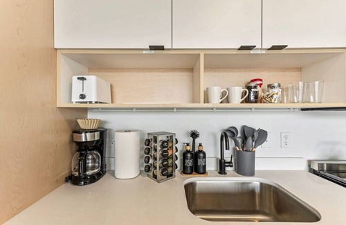 The kitchen area with numerous cooking appliances and spacious countertops is connected to the living area. If you want to take a break from the downtown Salt Lake City restaurants, then this is the place for you.