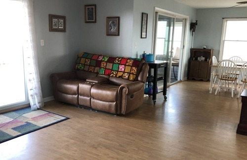 This floor has 2 bedrooms with a queen bed in one and 2 bunk beds in the other room (twin over full bunks). Sleeper sofa in the living room (not shown in pics as has not been delivered yet). Gorgeous views of the bay from living room, dining room, sun porch and back deck. Also beautiful views of the wildlife preserve from the front deck. Open floor plan which makes it look a lot bigger than the pictures.