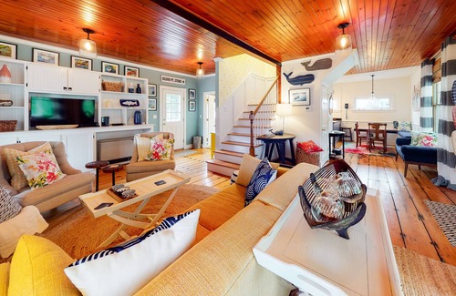 This three-story, 3BR/1.5BA cottage offers scenic views and summer adventure on every side. Greyview is set back from the waterfront, but offers great ocean views from the beautifully designed wrap-around porch, the primary bedroom, and 3rd floor living and viewing room. The 3rd floor viewing room boasts a large picture window, sitting area and window seats to enjoy and take in the breathtaking sunrise and sunsets, complete with telescope. Enjoy relaxing in the sun or a shady spot while sitting on the spacious porch, barbecuing on the grill and laughing with friends and family around the table in the outdoor dining area. The wrap around porch looks out to the ocean and over the neighborhood while inviting guests in. The original wide plank pine floors and wood beamed ceilings embrace the history of the home while updated amenities and bright decor give the real feel of a vacation home. You'll find a large living room, half bathroom/laundry, dining room and kitchen on the first floor. The large fireplace with wood burning stove adds to the Maine cottage appeal. The custom cabinetry throughout the home provides ample storage and charm. There is plenty of seating to enjoy a quiet book, fun movie, or a delicious bite to eat. The second floor provides two guest bedrooms, a full bath and a bright primary bedroom with water views. Head to the third floor to take-in open ocean views. The bunk room (located in a separate building not attached to the main home) features a full bath and is available May 15th - Oct 15th. The spectacular views and cozy setting will be the talk of your family and friends for many years to come, reflecting on the great memories made at Greyview.