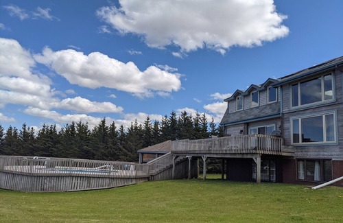 Set your mind and body adrift at "Drift Away Lodge" in Seawood Estates, Stanley Bridge. This luxury (5,000 sq ft) cedar log cabin features a 2500 sq ft wrap-around deck, plus an outdoor swimming pool and hot tub overlooking New London Bay and the Cavendish sand dunes. The fully equipped kitchen has built in stainless appliances and a bar with stools. 5 bedroom, 3 baths, plenty of space to stay together but not be together the entire time. Great room with 11 sky lights. Very quiet and peaceful. Many extras.