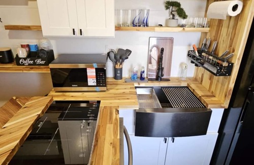 ★ Spacious Fully Equipped Kitchen with Island & all new Updated Appliances including full size refrigerator, dishwasher, garden sink, induction cooktop, microwave with built in oven and air fryer, waffle maker, mixer, coffee maker, plates, silverware, coffee mugs, wine glasses, utensils, bottle and can opener, strainers, pans, spatulas, cutting board, complimentary items, spices, and more.