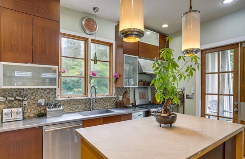 KITCHEN: Dishwasher, fridge, oven, 4-burner gas stovetop, microwave, breakfast nook, breakfast bar w/ seating, blender, Crockpot, coffee grinder, drip coffee maker, toaster, cooking basics, dishware & flatware, wine fridge, high chair