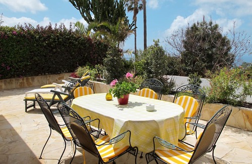 "El Puntillo del Sol", 4-room house 120 m2. Object suitable for 3 adults. Beautiful and tasteful furnishings: living/dining room with dining table, satellite TV and electric heater. Exit to the terrace. 1 room with 1 double bed. 1 room with 2 beds. Dining room with dining table. Exit to the terrace. Kitchen (oven, 4 ceramic glass hob hotplates, toaster, kettle, microwave, freezer, electric coffee machine). Bath/WC, shower/WC. No heating option. Terrace 50 m2 partly roofed. Terrace furniture, barbecue, deck chairs. View of the sea. Facilities: washing machine, iron. Please note: non-smokers only. R000000001