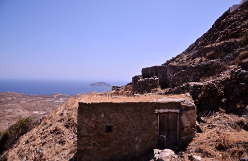 The house is at the lower level of a villa with the outstanding view, that is located at the edge of a cliff underneath the ruins of Byzantine times castle of Serifos. The villa has been designed by the famous Greek fashion designer, Dassios, who combined his aesthetic with the objects he has collected during his travels in a unique boho chic result.