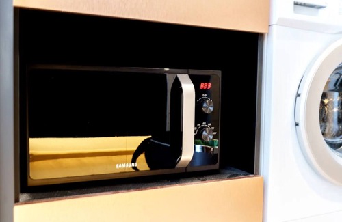Kitchenette: Refrigerator, stove, microwave, Kettle and cookware