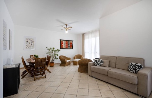 Relax in this welcoming and bright villa, featuring a spacious open-plan living and dining area, comfortable sofas, wicker accents, and vibrant wall art. The fully equipped kitchen includes a gas stove, oven, washing machine, and full-size refrigerator, perfect for preparing homemade meals. The villa offers three bedrooms, a private garden, and a convenient secure parking space. Enjoy natural light, thoughtful furnishings, and a warm and welcoming atmosphere, ideal for short or extended stays.