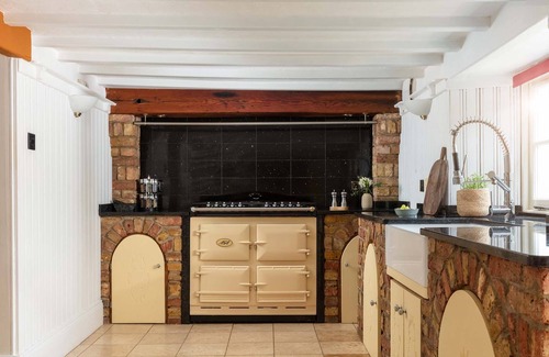 Well equipped country cottage kitchen which includes electric Aga with gas hob, dishwasher, microwave, American style fridge freezer, Nespresso coffee machine, wooden central island stone wall detailing.