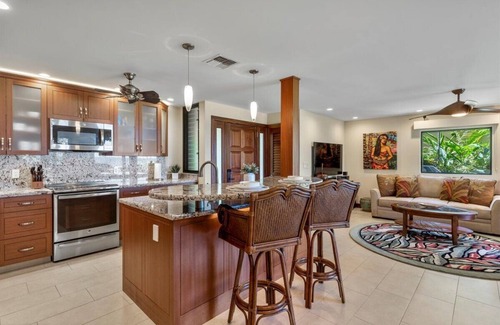 Featuring the highest quality finishes and handpicked local art and decor throughout, #1603 offers an exalted island experience. The large double lanai faces the ocean allowing for exceptional sunsets and Winter whale watching but is also tucked back enough to offer complete privacy during your stay. Central air conditioning in all rooms for added comfort during hotter Summer months.