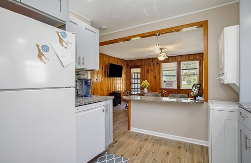 Upon entry, you'll be met with a bright interior and a warm feeling of welcome throughout the space. Settle onto the furniture and carry on a great conversation or watch a movie on the large TV in the living area. Enjoy preparing grand meals and lake picnic snacks in the updated kitchen, equipped with a breakfast bar and all the cupboard room you'll ever need. Sip your morning coffee on the covered porch as you enjoy listening to the birds waking up, and the sun coming up through the trees. With three beds and a futon, there's more than enough room for everyone to get a comfortable night's rest from the day's activities. Make memories of playing outdoor games in the yard, or roasting marshmallows around the firepit as the stars come out to dot the sky.