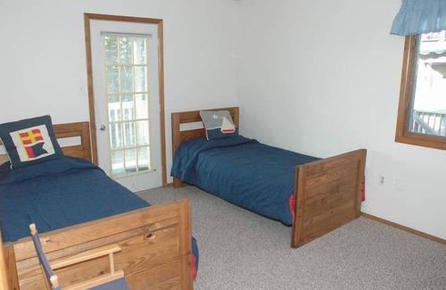 The master bedroom has a queen bed and its own bathroom with shower. The other three bedrooms share a bathroom with shower/tub. One bedroom has a queen bed; the other two bedrooms each have two twin beds. A third shower stall with dressing room is located under the house.