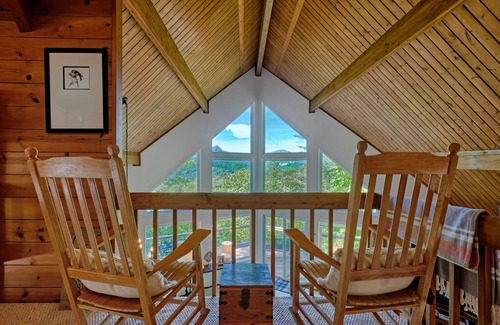With its glass walls offering breathtaking views of the mountains, Happy Jack's Cabin provides a unique experience. The loft area, featuring twin bunk beds and a king bed, offers beautiful views of the surrounding landscape.