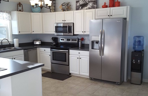 My wife and I invite you to view our home and hopefully make it your summer stay. Our home is in fantastic location, set back from the street and surrounded by mature trees giving a private feel, but only a short walk to the beach. The land mass here is not very wide, only 5 rows of houses from the beach to the main road and 1 row to the sound. That means there is no rush to get to the beach, sleep in; plenty time to find a great spot. The beach is large and most days the water has a glistening emerald glow. Also, a new beach access was built in 2017 and located close to the house. Our home features a spacious and open reverse floor plan with ceilings vaulted eleven feet. New for this year is all three bathrooms have been upgraded with vanities, counter tops, water fixtures, led lighting and toilets. The master bath also has a new enlarged shower. The living room has new reclining couches and the 1st floor entry has all new led lighting fixtures. Lastly the top deck is now finished with composite railing and decking. The top deck is now bare feet friendly and just a great spot to hang out The kitchen is roomy and fully stocked with everything needed to whip up a great meal, while watching the waves. There is seating for six at the kitchen peninsula. The main feature of the dining area is a handmade reclaimed wood table, that seats six comfortably and still have a nice view of the ocean.. After dinner hit the couches, relax and watch some TV. This year we replaced all the tv's with Samsung Smart TVs. They all have HULU loaded and now you have the ability to watch your favorite steaming service. Better yet, grab a drink and step out onto the deck and just relax, watch the waves and listen to that ocean. Also on this level are a half bath and a large pantry. The 3 bedrooms are located on the first floor. We have a master with a king size bed, memory foam mattress, attached bath, large closet and a wall mounted 55 inch flat screen TV . This room has access to the first floor deck. Second bedroom features a queen size bed ,memory foam mattress, large closet and a new wall mounted 32 inch flat screen TV. This room also has access to the first floor deck. The third bedroom has 2 twin beds, a small closet and a new wall mounted 32 inch flat screen TV. All the bedrooms feature ceiling fans. The main entry is on the ground level. As you enter the house you come into a laundry area/catch all, great place to drop all the beach gear. One flight up and you're on the bedroom level. Outside we have a large private newly built outdoor shower with hot/cold water with Trex decking next to a nice seating area under the house. Also, we have a large picnic table and a new gas grille, great for a quick outdoor lunch. Anyone making a trip to the beach knows how valuable that packing space in the car is, so we have beach chairs and umbrellas for you to use. We have plenty of parking and all the exterior lighting is dusk to dawn, making it safer coming and going at night. We are located approximately 3 miles from the center of town, close enough to bike and explore. We are renting Sunday to Sunday. This year we added towels and linens into the booking fee, if you don't need them, let us know and they will be removed before you book. We try very hard to keep our place updated, clean and comfortable for our guest. Please read our reviews and feel free to contact Stephanie with any questions. Thanks for looking and we hope to hear from you. John & Steph