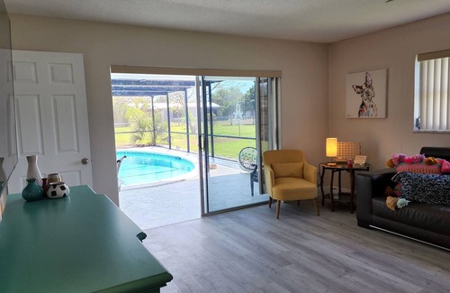 Are you looking for the perfect home to spend your next vacation? If so, look no further, Acres of Sunshine is for you! Our home is not only comfortable and stylish, it is spacious enough to sleep six to seven people! It's also perfect for hours of outdoor fun! You may want to jumpstart your day with a crisp cup of coffee from the coffee bar and catch a beautiful sunrise on the covered lanai! Or you may decide to take a dip into the inground pool! Not to mention, there is canal access right in the backyard for even more excitement! If you're up for adventures and fun in the sun, Acres of Sunshine is roughly 30 miles from Fort Myers Beach, and not too far from destinations such as Cape Coral Beaches and Sanibel Island! If a staycation is more your speed, the spacious living room and den are perfect for group activities, family movie nights or simply relaxing. Safety is a top priority in our home, so we've added additional preventative measures to keep our air clean with a built-in air purifier, UVC lights for disinfection, and completed and up to date maintenance on all smoke alarms and carbon monoxide detectors and fire extinguishers. Now, what are you waiting for? Book your stay today!