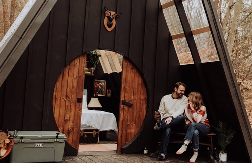 Enjoy the simplicity and elegance of a cozy bedroom in the woods. These compact, yet luxurious a-frames are designed to provide unparalleled comfort. The Hideaway Hut offers a queen size bed with luxury linens and a private firepit area in the perfect setting for a relaxing outdoor experience. Perfect for solo travelers, couples and group getaways. The cabins are thoughtfully situated, ensuring a 2-5 minute stroll to a state-of-the-art, climate-controlled bathhouse offering hot showers, premium toiletries, and a sophisticated design for your convenience.