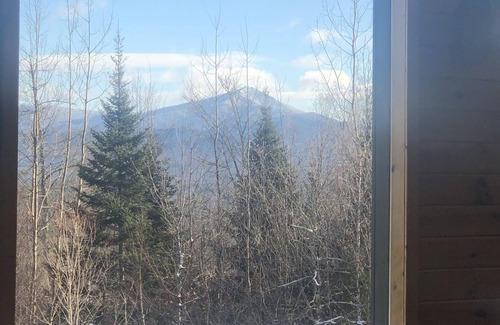 -Great room with cathedral ceilings and large windows with walkout deck with a three-season mountain views, a picnic table and other outdoor seating