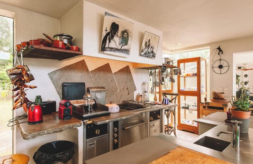 The interior of the villa includes a spacious and well-equipped kitchen, with a blend of rustic and modern design elements. Large windows flood the kitchen with natural light and offer a breathtaking view of the pond, creating a harmonious connection between the interior and the exterior.