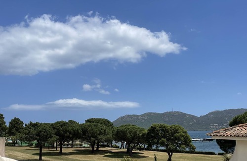 Studio for 2 people fully equipped with large windows opening onto a beautiful tiled terrace sheltered by 9 sqm with electric shading awning, with breathtaking views of the Gulf of Porto Vecchio, direct pedestrian access to the beach and all the public facilities from MARINA DI FIORI
