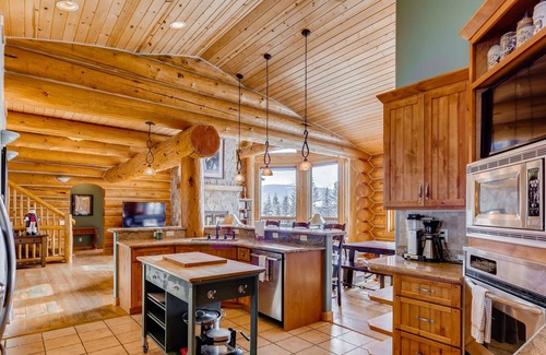 This expansive 6BR/4.5BA home boasts two living areas, two decks with mountain vistas, and a private hot tub.