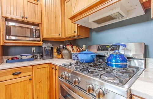 There are two living rooms for guests to spread out, including a downstairs den with a wood-burning fireplace, billiards table, and TV for movie nights or rainy-day lounging. The full kitchen includes stainless appliances, a large prep island, and all the basics for cooking at the cabin. Both bedrooms are designed for rest and relaxation, with flexible layouts that work well for couples, families, or groups of friends. Three and a half bathrooms help mornings run smoothly, and an in-cabin laundry room adds extra convenience for longer stays.