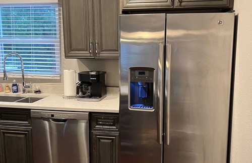 Perfect for getaways or business travelers, this one-of-a-kind rental offers unmatched convenience and luxury. Located on a private second floor, this apartment boasts off-street parking and a fully appointed kitchen with top-of-the-line appliances, including a gas range, microwave, dishwasher, side-by-side refrigerator with water and ice dispenser, and a built-in wine fridge.