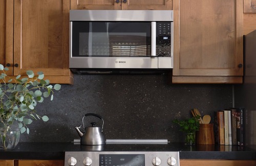 Enter this top-floor unit with high vaulted ceilings via the kitchen and great room. The design is breathtaking and inspires a peaceful vibe. The kitchen is a chef's delight, made for foodies. It's finished with black granite countertops, top-of-the-line appliances, and All-Clad cookware. Plus small touches like a 9-quart slow cooker, a full suite of chef knives, espresso, and multiple coffee maker options, a full bar set up with glasses for all your favorite libations, and everything you'd want for fine dining. The condo is stocked so you don't have to go out for anything, including soaps, shampoo, paper goods and fully stocked cabinets with food and spices. The dining space can seat up to 8, and the custom L-shaped couch doubles as a queen-sized, inflatable (and comfortable!) pull-out. Enjoy cozying up by the gas fireplace while streaming a movie on the Smart TV. The balcony overlooks the village and is an amazing space for enjoying cocktails or a meal.