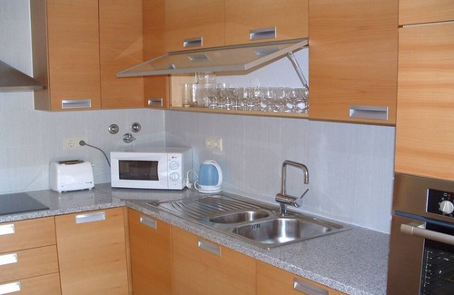 A door from the lounge/dining area leads to a separate well-equipped kitchen which has an electric oven and hob, a microwave, fridge/freezer, dishwasher, washing machine, electric kettle, toaster, coffee maker, blender and pots, pans and crockery.