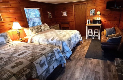 The Norway Chalet is a beautiful, rustic cabin that features an intimate setting with one bedroom and two double beds by the cozy in-room fireplace. Perfect for a family of 4 or two couples looking for some relaxing time away, the Norway is your next "Home away from home". The property provides lots of space with a porch and fire pit in pure nature under Pine Trees - the perfect location for campfires. You're welcome to bring your pets.