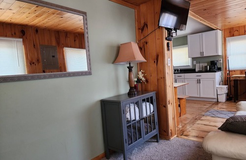 Welcome to the Family Cottage, a delightful blend of yesteryear's allure and today's conveniences. Cross the threshold through the charming antique wood screen door and find yourself in a luminous kitchen, boasting light wood floors and an inviting wooden bench-style dining setup. Seek inspiration at the quaint writing desk or share stories in the cozy living space, complete with plush seating and a TV for entertainment.