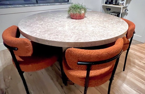 * Round dining table with seating for 5-6 in kitchen. Bar in living room with 4 more seats.
