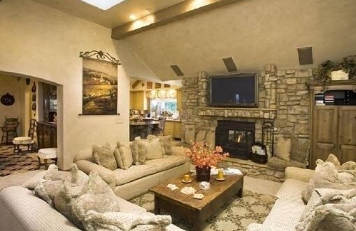 The ground floor boosts a large entry way with distressed crown molding that leads to a formal dining room and living room with shared pass-through gas fireplace and vaulted ceilings; breakfast nook and family room with shared pass-through gas fireplace, wet bar and 45” Plasma television above fireplace, a large eat-in gourmet kitchen with spacious granite top island, top of the line appliances; dual Sub Zero refrigerator and freezer, dual Gaggenau ovens, Wolf stove top with grill, dual Wolf warming drawers, Wolf microwave, dual Fisher and Paykel top loading dishwashers, trash compactor, large pantry and French door leading to a private heated garden patio with gas grill, fireplace, and in-ground Jacuzzi hot tub. The ground floor master bedroom suite also has French doors leading to the outdoor in-ground Jacuzzi hot tub. It offers a private sitting room/ office with a 38” Plasma television and pass-through gas fireplace to the bedroom. The bedroom has a library, a 45” Plasma television over the fireplace, a kitchenette with coffee maker refrigerator and microwave, private in-suite bathroom with 45” Plasma television over the fireplace, steam shower, large Jacuzzi tub and spacious walk-in closet. The ground floor guest bedroom also known as “The Angel Room” offers a queen size bed with large closet, full bath and television and private outdoor patio. The laundry room with LG steam washer and dryer is also located on the ground floor.