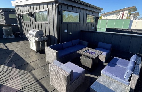 The entire rooftop is your private patio space with outdoor furniture, a gas fireplace, and a gas grill. The patio gives 360-degree views of the city skyline, Empower Field, and the mountains.