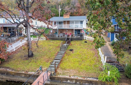 Beautiful Lake of the Ozarks home just outside of Camdenton, MO. Quiet lakefront property perfect for swimming, skiing, boating, and fishing. Just a 10 minute drive from Old Kinderhook and Lake Valley golf resorts! Big Island is a 2.7 mile loop along the Little Niangua with stunning views of the lake from the property and around the island. A short drive from any major city in Missouri makes it a perfect weekend getaway or week-long vacation spot. The space The downstairs is complete with a full kitchen, family and dining area, and a full bathroom. The upstairs houses all of the bedrooms with a second family room and another full bathroom. The three bedrooms will accommodate six people. In addition, two fold out couches will sleep an additional four people. Bed linens and shower towels are provided as well as a small stock of beach towels. Start your morning off right with a cup of coffee on our large deck / patio with stunning views and ample seating. Or grab a book and relax on the upper deck while the kids sleep in. As your day gets going, please enjoy our large swim dock that includes a table and chairs with tons of seating to watch the fun on the water. Our new dock steps make it easy for people of all ages to get up and down from the dock while swimming. We do supply some life jackets for our renters to use, but we can't guarantee a jacket that will fit everyone in your group; so feel free to bring your own. We recommend having your kids wear one any time they are on the dock or near the water. In the evening, enjoy our close and convenient access to the kitchen right off of the lower deck and be ready to heat up the gas grill that is provided for your use. If you are bringing your own boat, we have a 10 X 20, covered slip available for your use at no additional charge. There are two TVs in the home with movies to watch on a rainy day. We encourage our renters to bring their own streaming devices (ex. Chromecast) if they would like to stream their own shows. Our home DOES NOT offer cable TV or local channels