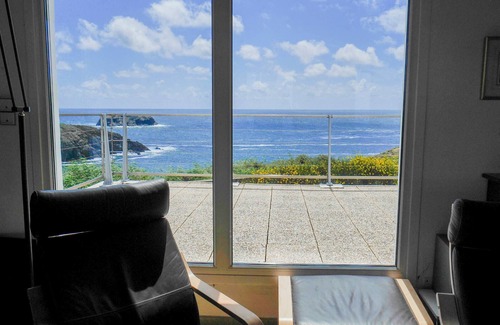 - Un salon (50 m²) avec table et chaises, télévision, canapé, fauteuils, cheminée et un balcon. Magnifique vue sur la mer du séjour et de la terrasse, vous pourrez contempler la côte sauvage du sémaphore de Domois en passant par la anse de Goulphar jusqu'aux aiguilles de port coton.