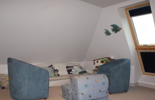 Upstairs in the attic, a dormitory space, with a floor area of 34 m2, is furnished with 2 beds of 80 x 190 and an extra bed for children, and a reading and games lounge area. Sea view.