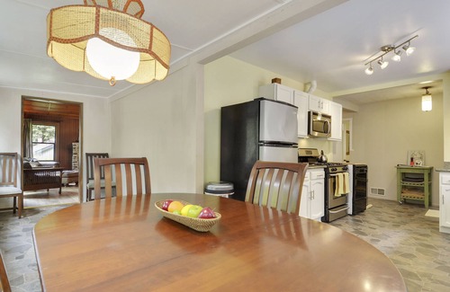 Glen Tara's large living room, modern kitchen, bright dining room, 3 bedrooms and 1 of the full bathrooms are all located on the upper level (the main living level). All 3 bedrooms feature Queen beds. From 2 newly remodeled bedrooms, there are lovely windows to the creek and hills. A skylight illuminates the third bedroom with natural light. The main bathroom has a tub/shower combo and is conveniently located between both main bedrooms. The second bathroom (with a shower) is the only room located on the lower basement level (mostly used for storage). There are interior spiral stairs leading to the lower level bath.
