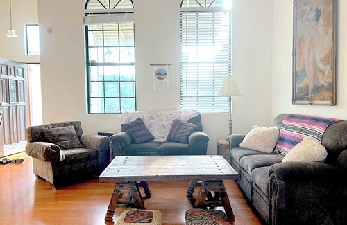 Located in Lower Lake, this artistically-decorated country home boasts 3 bedrooms including a king bed, child bed, full beds, and twin beds with nature views outside of every window. A peaceful sanctuary, you'll have privacy and safety within the 10-acre gated property, which also includes private trails to lake views. In addition to three bedrooms, the large sun-filled yoga/dance/fitness room is perfect for early morning stretching or children playing. We hope you'll enjoy your stay at our country house/chateau.