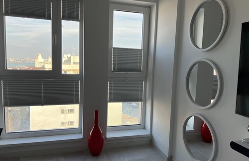 The penthouse studio is located in the Militari district, not far from the Plaza Shopping Mall, the AFI Shopping Mall and in a quiet location on Lake Morii. The center (Old Town) is not far from the apartment. The studio has a view over Bucharest. At night, the lights of the illuminated city can be seen from the living room and bedroom, as well as Lake Morii. The studio is luxuriously furnished. High-quality German parquet, a modern galley kitchen with Home-Connect devices such as a refrigerator, dishwasher, oven with microwave / grill, ceramic hob and Nespresso coffee machine round off the kitchen in black. The studio is fully equipped with E-Home, all functions can be controlled via Apple Homepods, such as heating, air conditioning, Apple's sound system brings music to every room with Apple music. The bathroom is equipped with a modern shower. The electronic door lock from NUKI facilitates access via keypad and the elevator gives you direct access to the underground car park. A parking space in the underground car park is available. The penthouse is equipped with air conditioning. Ideal for short and long term stays.