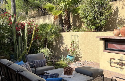 This property is close to shopping, dining, medical and wonderful hiking trails. The bedrooms are updated and one bathroom includes a garden tub and shower, Gorgeous outdoor space and a well kept and updated interiors with comfortable beds and linens. The patio has an electric fireplace which is visible from the comfortable living/dining area. Well stocked kitchen with granite and all of the amenities . Courtyard entry and very private patio with lovely views and occasional wildlife sightings.