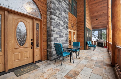 The log cabin-style home is timeless with handsome leather accents, a cascading rock fireplace, and modern amenities including WiFi and stainless steel appliances. Soak up the fresh mountain air on your spacious front deck or flip a juicy hamburger on the gas grill. A bistro table and private views of the trees make this outdoor space a perfect summer hangout.