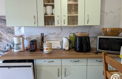 The kitchen is equipped with an oven, a refrigerator, and a dishwasher, as well as a microwave. And you can even travel light because you'll have a washing machine.