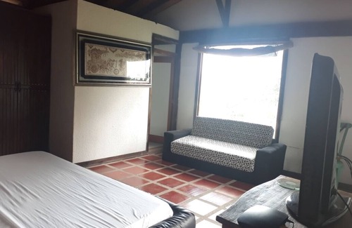 hermoso lugar rodeado de naturaleza, con vista a cultivos de banano y platano, la finca esta situada a orilla de carretera a solo 1 minuto del pueblo a 5 minutos del parque del café y otros parques recreacionales. Para 18 personas hasta 26 máximo. 6 habitaciones 5 baños, kiosco con cocina montañera, parrilla y todo de cocina, piscina grande, jacuzzi en terraza y turco.