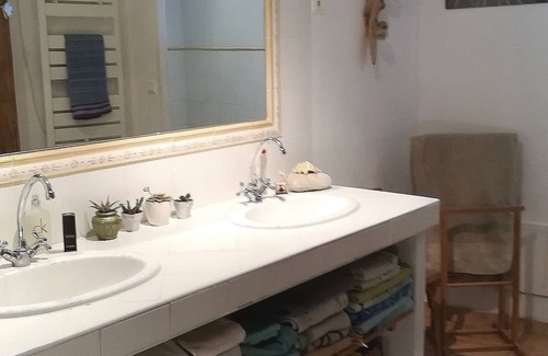 Our rental, independent from the ground floor, includes: a master bedroom, its bathroom, two sinks, with walk-in shower, a toilet, a large living room and its fireplace with insert, very comfortable convertible sofa bed for a couple in addition (10 € / pax), a beautiful terrace of almost 60 m2.