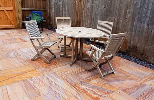 - Backyard with seating and plants**, perfect for relaxing or dining outdoors.